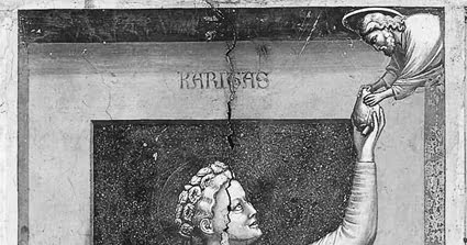Più avanti Guénon rileva “l’ortografia non normale di Karitas”31: anche in questo caso si sbaglia. Andrea Pannonio fu anch’esso miniaturista e incisore, come Pisanello visse in pieno XV secolo, scrisse nel 1467 un Libellus de regiis virtutibus nel quale scrive correntemente il termine karitas32. Nella Cappella degli Scrovegni a Padova, affrescata da Giotto intorno al 1306, tra le raffigurazioni delle virtù teologali si legge la grafia Karitas; lo stesso nella cappella di stile romanico di Ognissanti a Ratisbona l’allegoria delle tre Virtù cardinali è accompagnata dal nome Karitas.